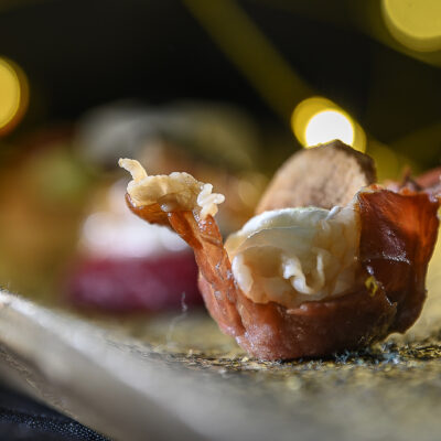 Parma ham basket with labneh, truffle or herb oil & Jerusalem artichoke crisp