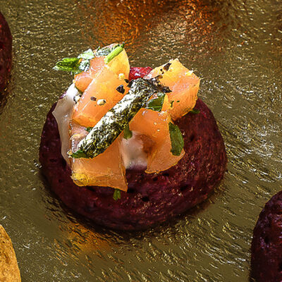 Beetroot blini topped with local crème fraîche, smoked salmon & golden nori