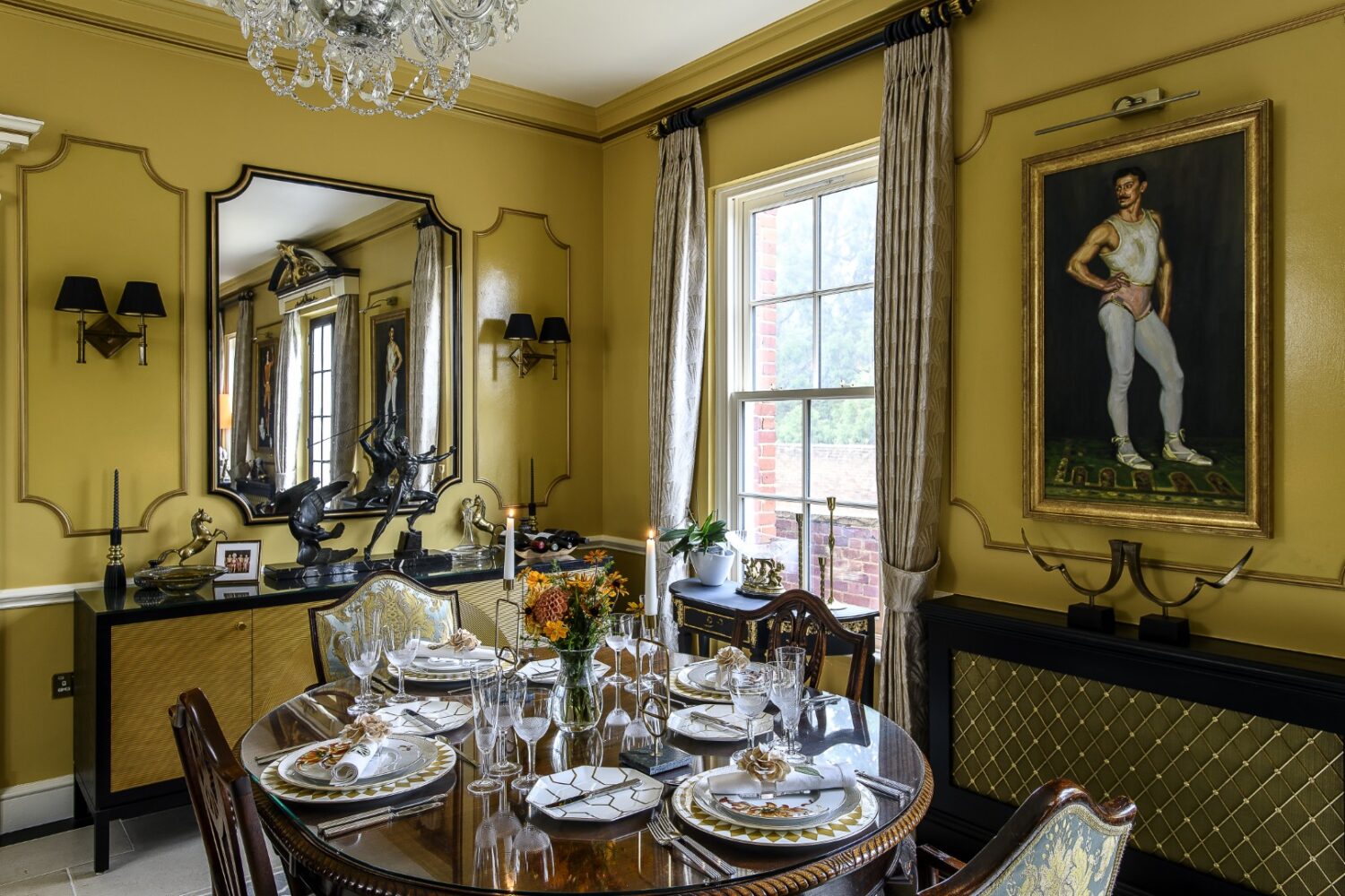 “In the 80s the song-writer and composer Eric Woolfson, from the Alan Parsons Project, lived here and there were two pianos in this room. It’s a space that is meant to be enjoyed, so we refurbished the marble floor with a diamond polisher to bring the sheen back up, we re-polished the huge mahogany doors and repainted the surrounds. I used a rich yellow ochre colour on the walls which is quite traditional for an English country house hallway but added my look and feel with black and gold furniture and gilded panelling, dado rails and vintage chandeliers.”