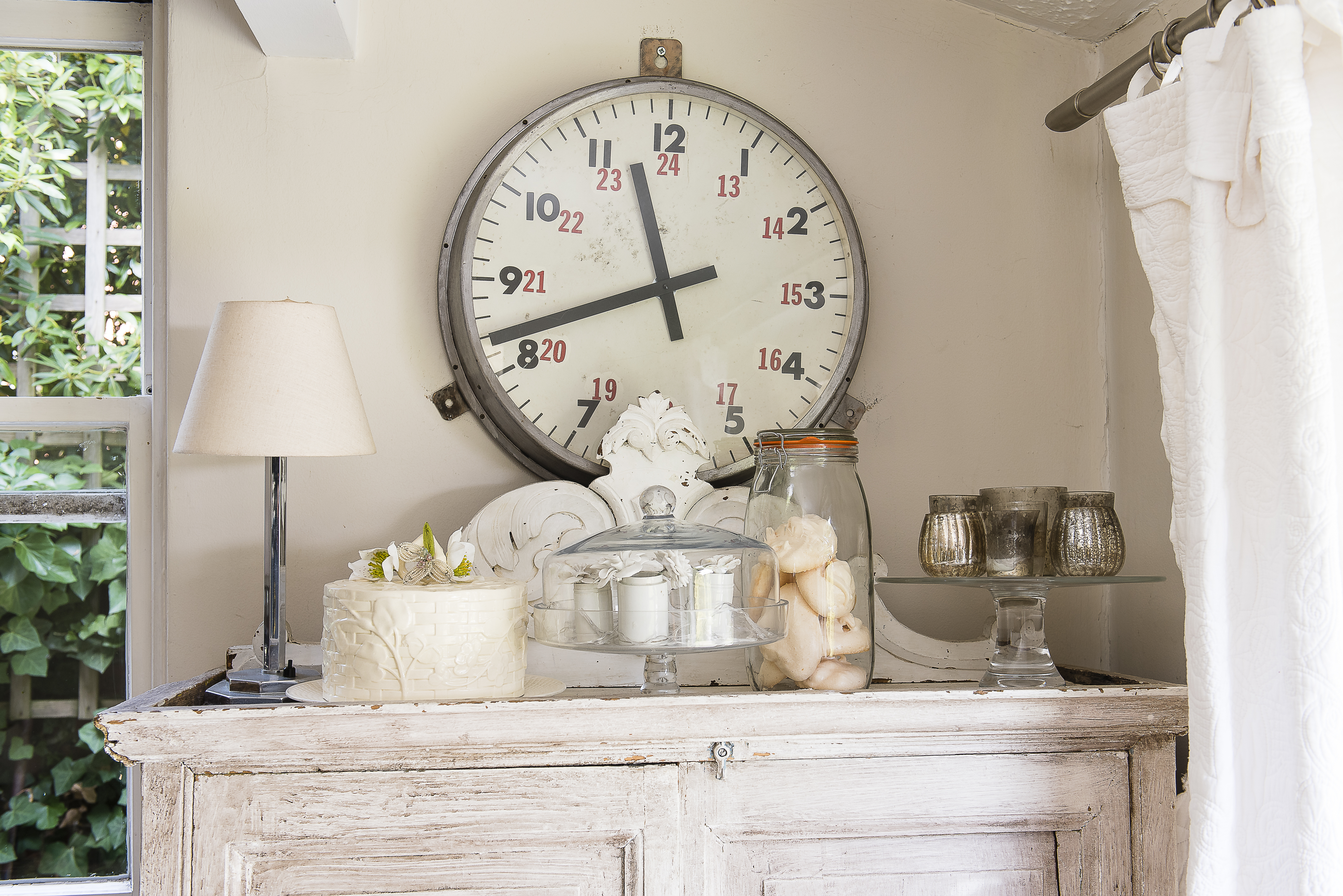 The linen cupboard is a French antique and the refurbished German station clock was from Russell Callow. The chairs are 1960s Danish and Charlotte made the curtains from a French cotton piqué bed cover