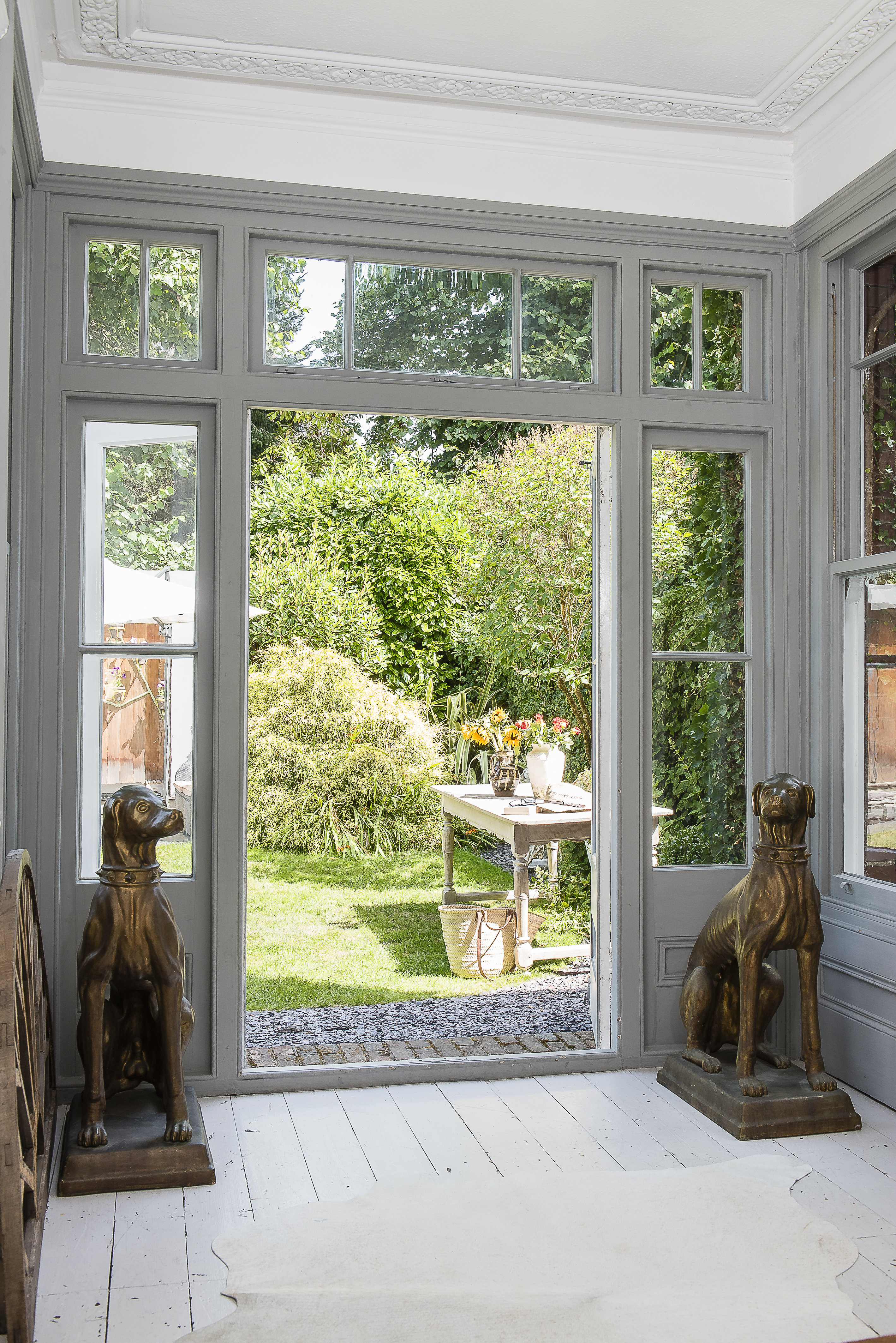 The view out into the garden. The dog statues are for sale