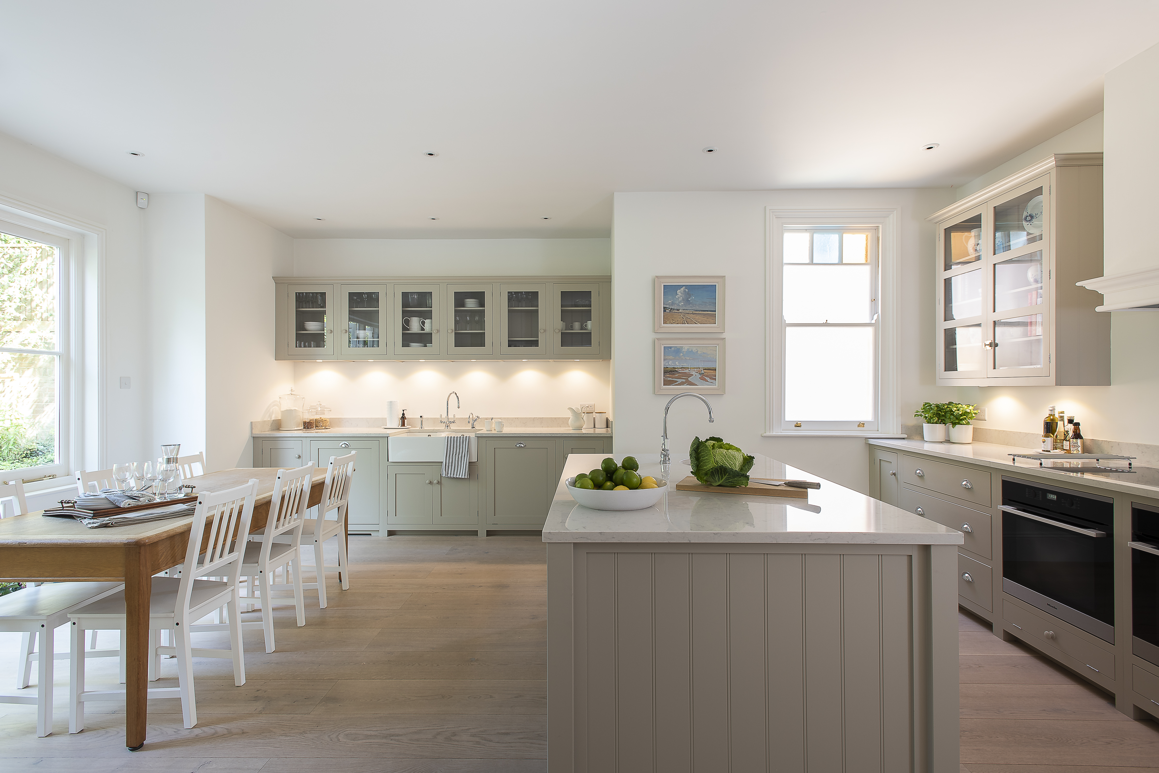 We re-enter the house into the kitchen, now a tranquil lofty space big enough for a generous kitchen table and a large island, which Alex designed in collaboration with deVOL. The walls are a Dulux white, the worktops marble-effect quartz – “because real marble just isn’t practical” – and the tongue and groove units are painted a soft mushroom. Cupboards on the wall behind the central island contain their collection of the brilliant enlarged version of the classic hand-painted Royal Copenhagen pattern Musselmalet (called Musselmalet Mega), which Alex has arranged very satisfyingly in asymmetric/symmetric formations.