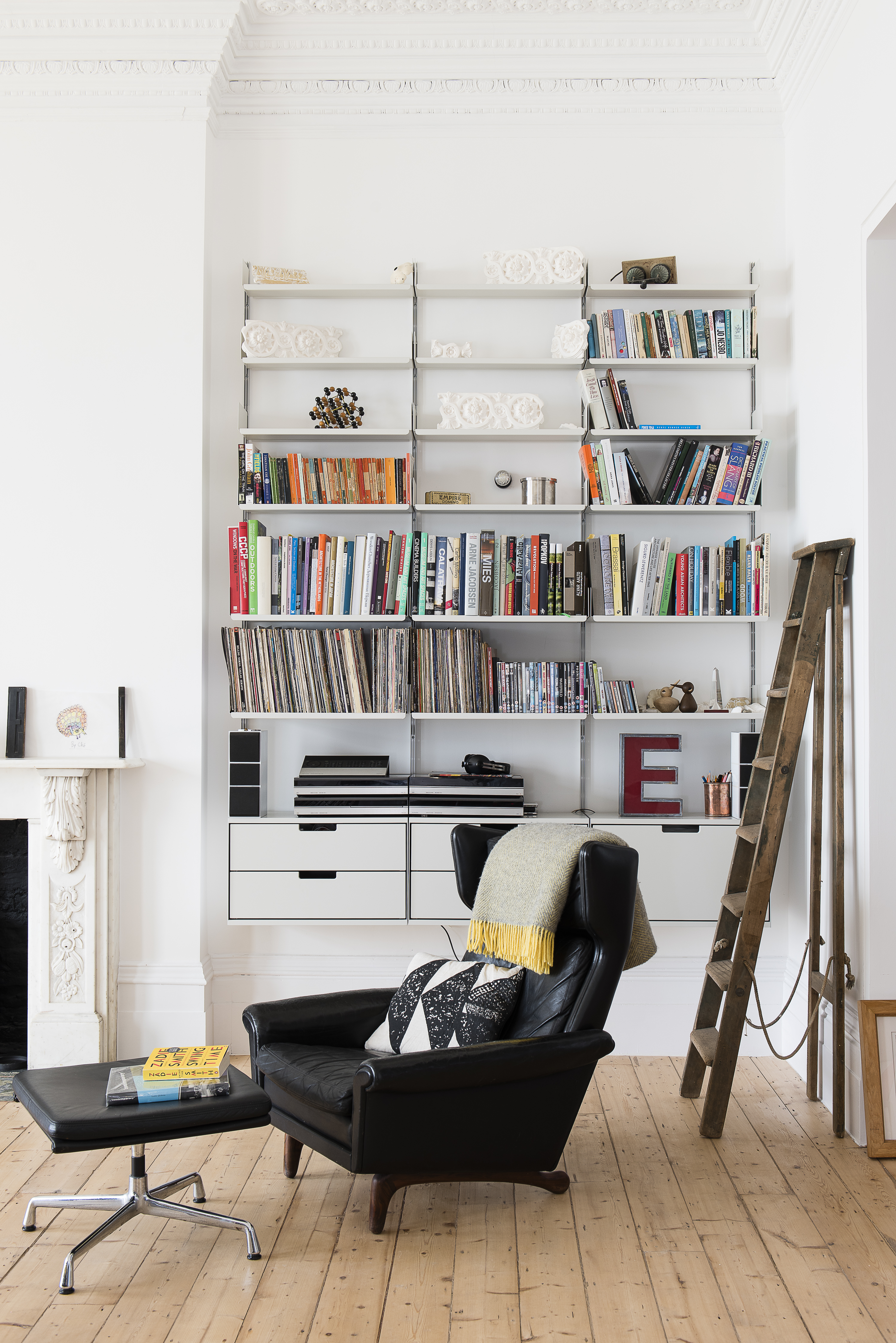 A giant roll of cord from local haberdashers Wayward has been transformed into a side table and an old French bread-basket, discovered in Sideshow Antiques on Norman Road, has been turned into a fireplace wood basket. Architect favourite Dieter Rams’ shelving by Vitsoe offers touches of modern convenience within the minimalist yet very warm aesthetic.