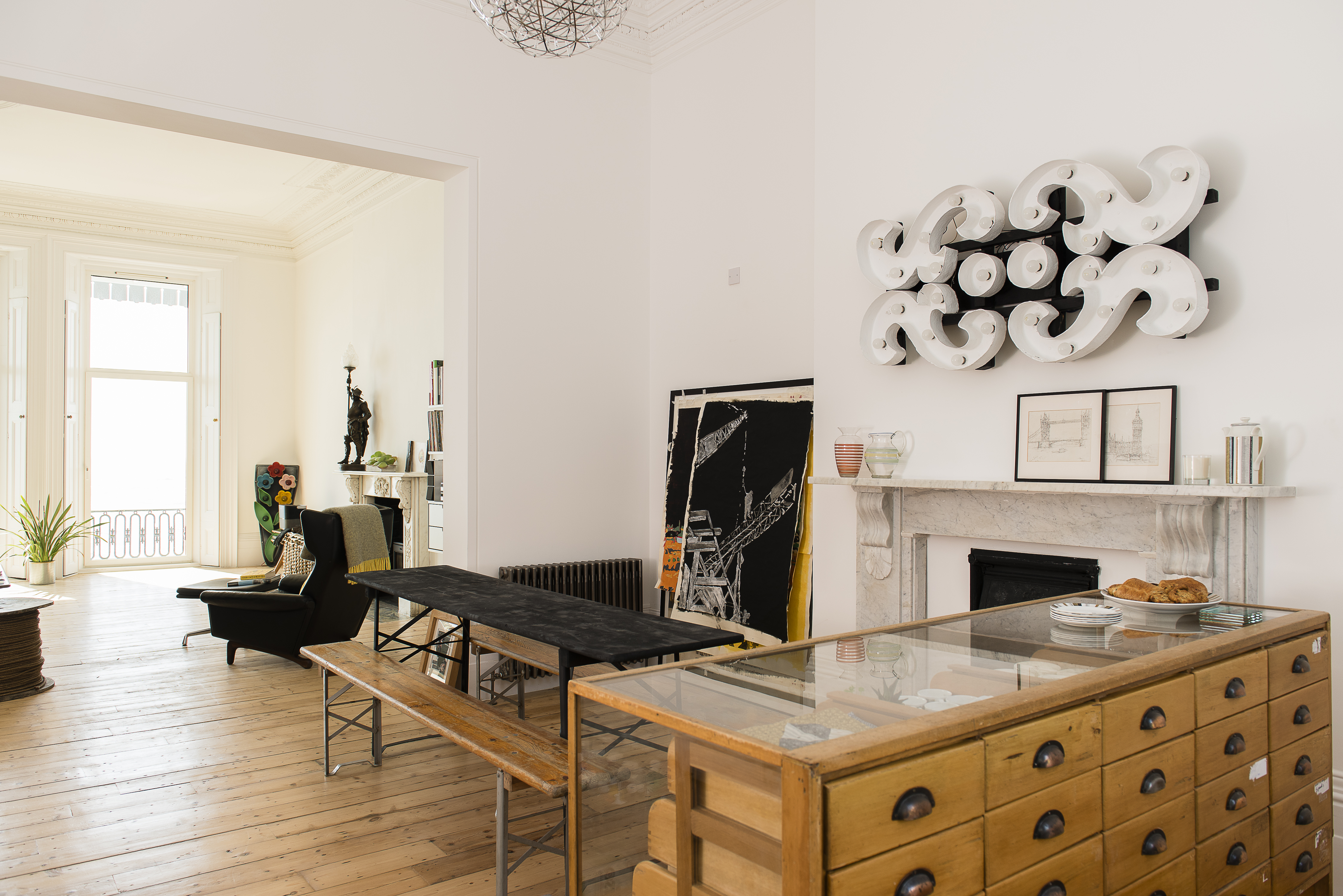 The couple chose not to have a splashback, preferring to keep the lines clean which means that the kitchen flows seamlessly from the reception room, working as a dining room and a work space. A refectory table and benches and a series of pendant light bulbs offer the perfect studio area for Ed, who, since moving to Hastings, has picked up his paintbrush once again. Following the purchase of a series of original Russian TASS agency propaganda posters from local dealer Russell Baker at the Baker Mamonova Gallery on Norman Road, Ed is now creating his own versions in paint, including the neighbouring Marine Court, which obviously still has a place in their hearts.