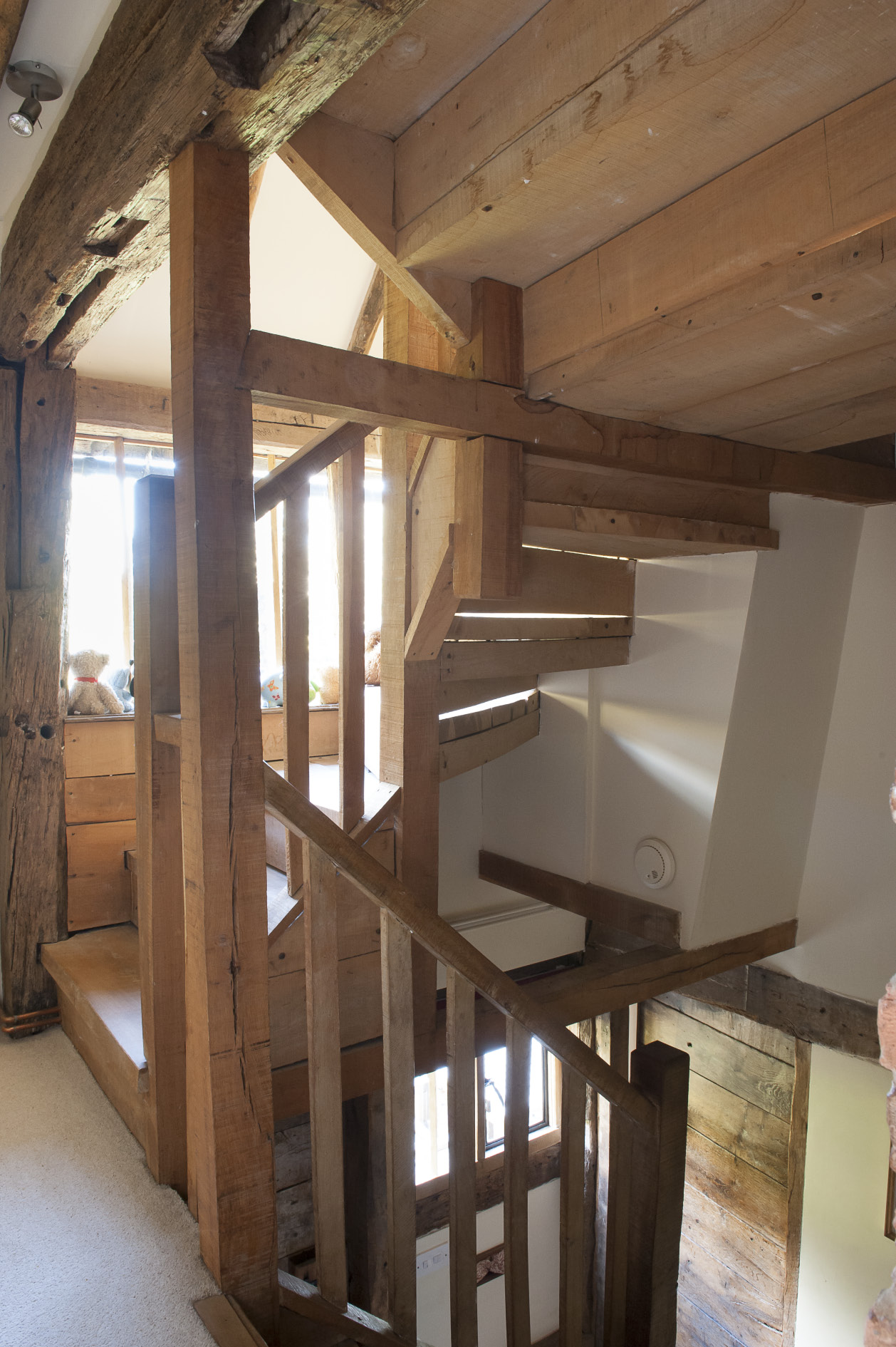 Green oak was used to make the stairs, primarily for its inherent flexible qualities which allowed it to mould around the huge central chimney and move with the varying temperatures within the house